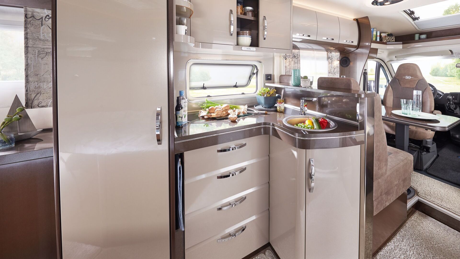 Wyposażenie Twojego przewoźnego domu uwzględnia kuchnię z palnikami i patelnią, przestrzeń sypialnianą dla dwóch lub czterech osób, toaletę z prysznicem i część jadalnianą.