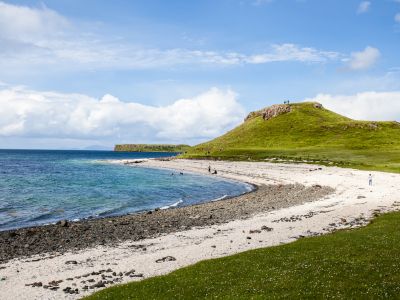 Wybierzemy się na spacer po białej plaży otoczonej turkusową wodą i dziką przyrodą, która tworzy niecodzienny kontrast na szkockim wybrzeżu. Będziemy wsłuchiwać się w szum fal, odkrywać fragmenty rafy koralowej i muszle oraz podziwiać ocean. Mało kto spodziewa się tak jasnego piasku w tej dzikiej krainie – to niespodzianka dla zmysłów.